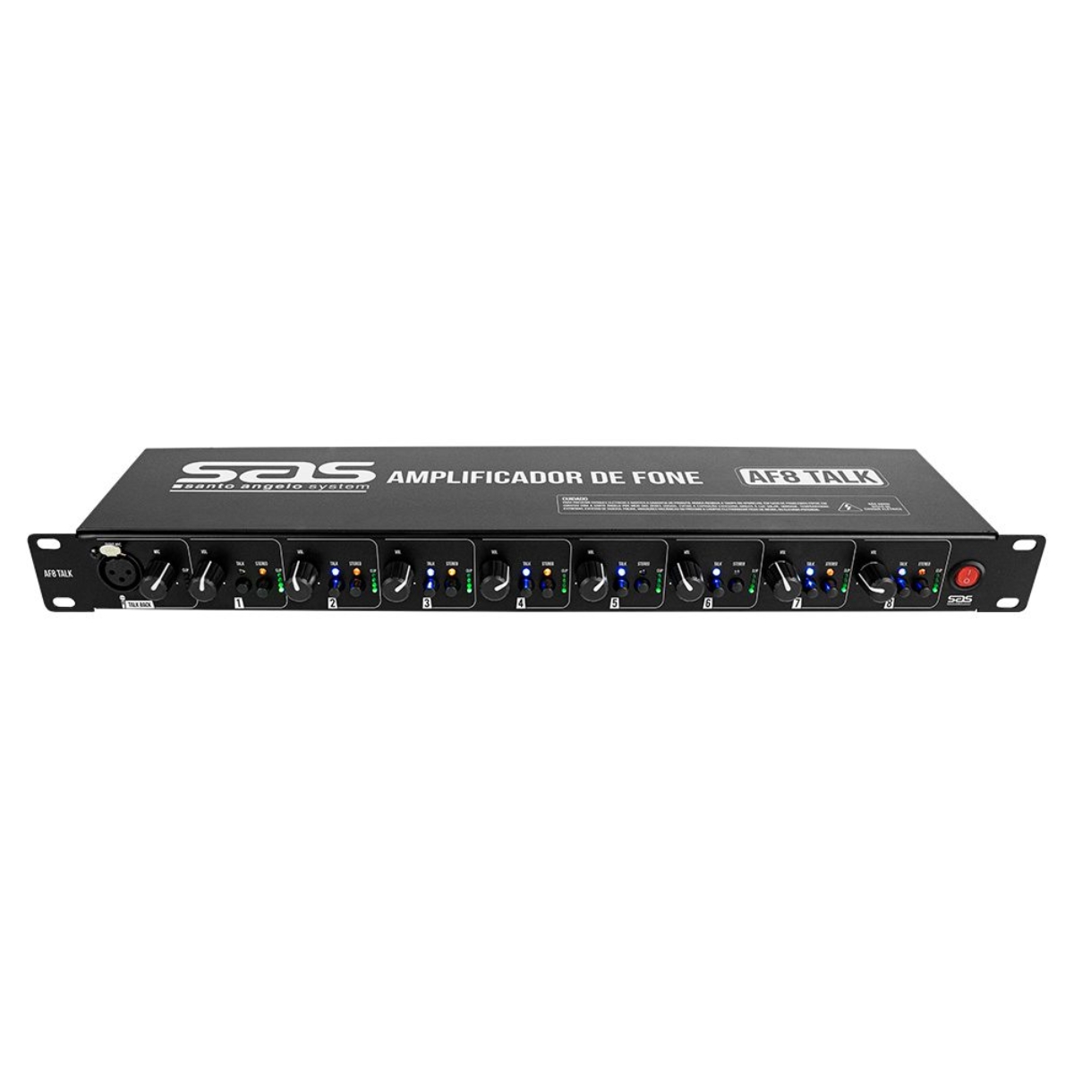 Amplificador de fones AF8 TALK com 8 canais independentes (mono / estéreo) e um canal de talkback. Com a entrada talk, o técnico de áudio tem a liberdade de fazer a comunicação interna com os usuários sem a necessidade de utilizar um canal da mesa de som. Para isso, basta acionar a chave com a função talk no canal de fone desejado.