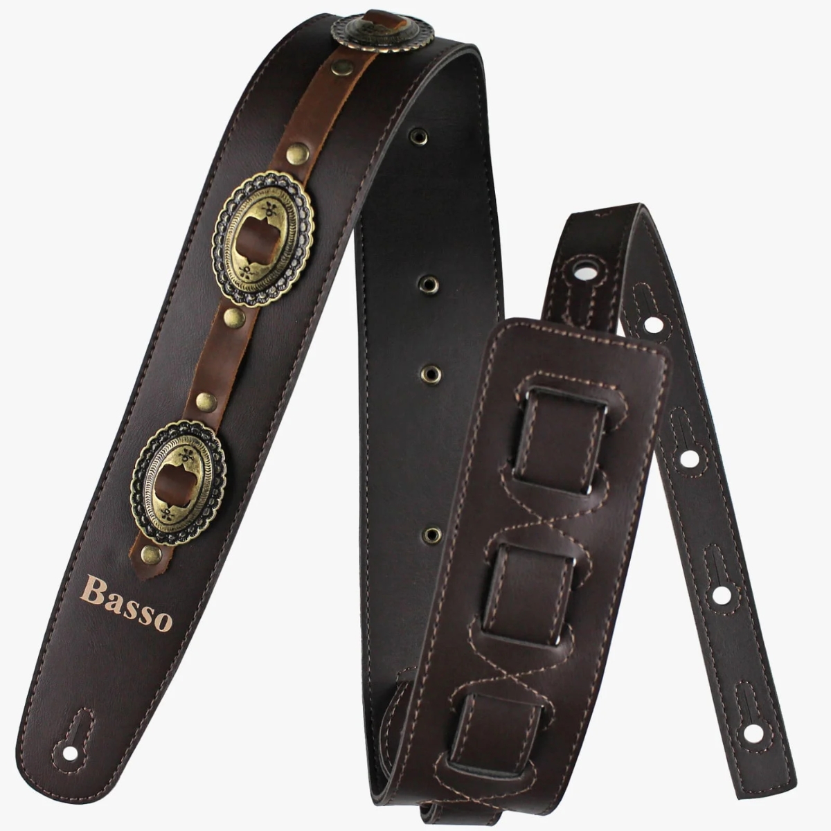 A Basso produz a correia em material sintético, disponível na cor marrom, com aplicações em metais e 5 conchos com banho em ouro velho. A correia para guitarra, violão e contrabaixo, oferece durabilidade e conforto. O forro sintético protege a correia, evitando a absorção de suor. Confira!